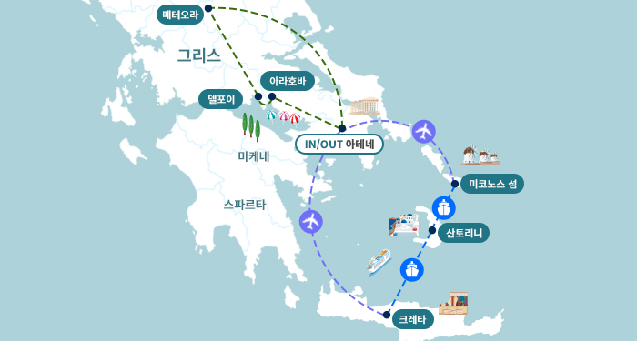 인천-두바이-아테네-수니온곶-아테네(1)-[중간항공]-크레타(1)-[페리]-산토리니(2)-[페리]-미코노스-[중간항공]-아테네(1)-아라호바-델피(델포이)-메테오라(1)-아테네(1)-두바이- 인천